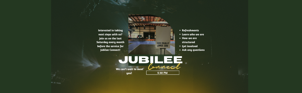 Jubilee Connect is the first step for anyone new at Jubilee City Church who wants to get involved. It happens on the LAST Saturday night every month at 5:30 PM BEFORE the service!